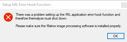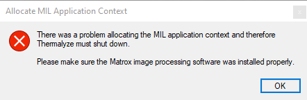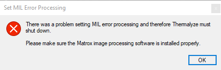 "Allocate MIL Application Context", "Set MIL Error Processing", and "Set MIL Error Processing" error messages displayed when starting Thermalyze, which cannot open