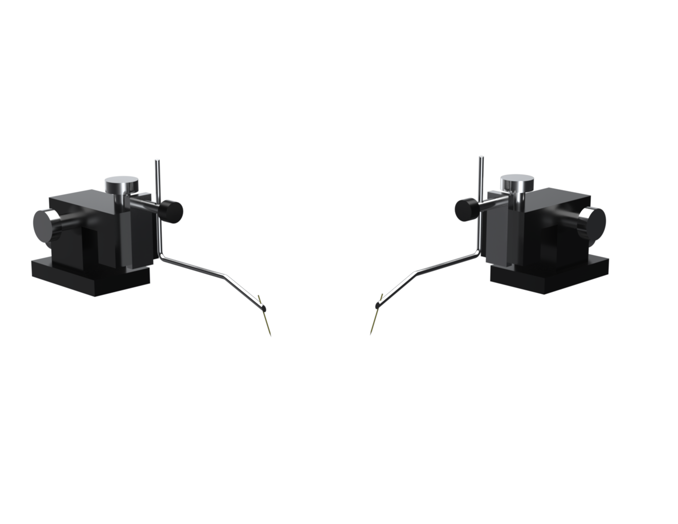 Enables precise positioning of needle probes onto semiconductor pads. Each probe has a magnetic base and can be adjusted in the x, y, and z directions with +/- 7.5 mm movement along each axis. A wire lead with gold-plated contact pin is used to make electrical connection to the needle probe. Probes are offered in both left and right-hand versions. The right-hand version is shown.