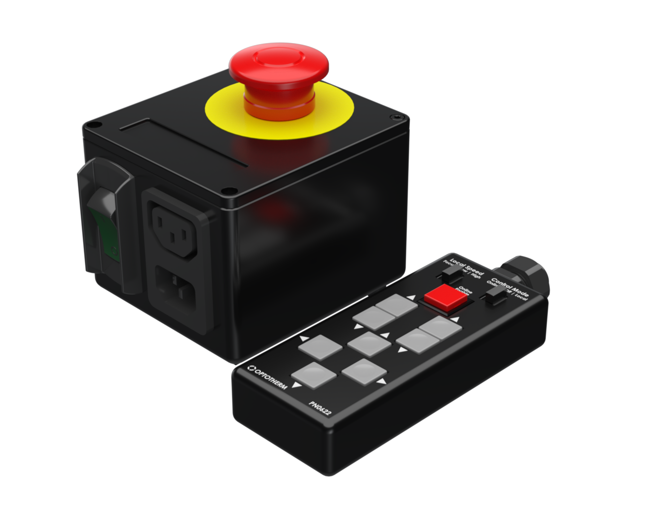 Contains an emergency stop button and motor controller jog remote with both local and online control.