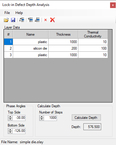 Sentris provides a simple method to describe the internal structure of a device by entering the thickness and thermal conductivity of each material layer. Phase angle data from testing the device on both the top and bottom sides is then entered to calculate defect depth.