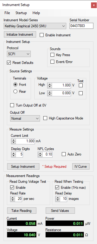 The Instrument Setup window within Thermalyze is used to set up and control a Keithley voltage source (such as a source measure unit) via USB interface.